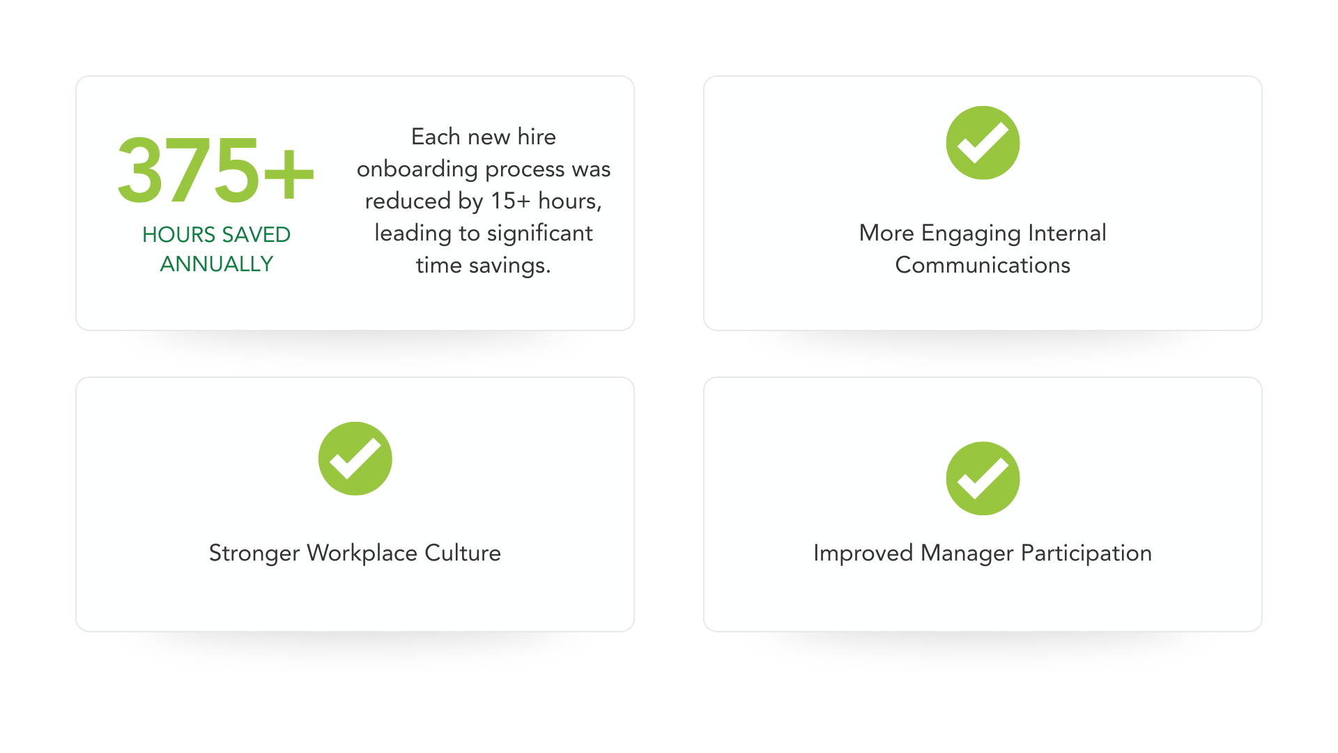 375+ Hours Saved on Onboarding – Each new hire onboarding process was reduced by 15+ hours, leading to significant time savings.