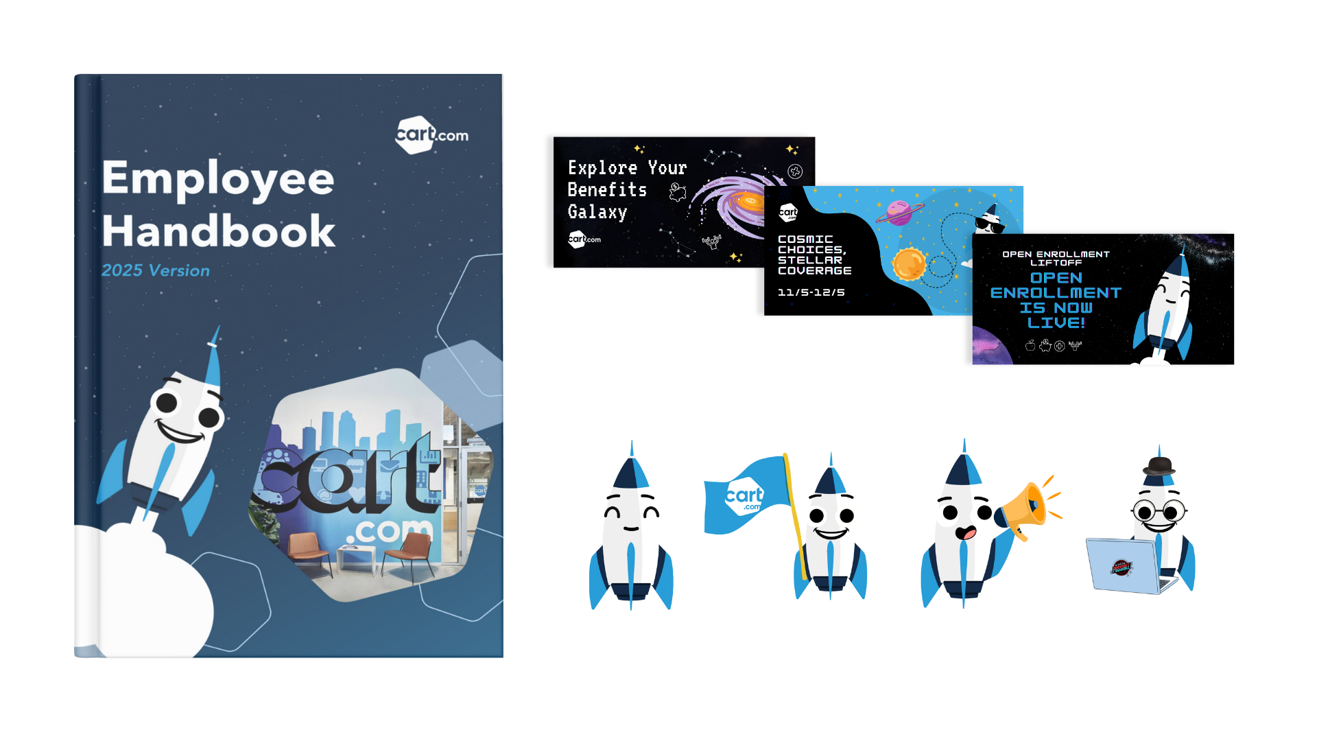 Cosmo: The Brand Voice of Cart.com: Introduced 40+ variations of “Cosmo,” a rocketship mascot representing company growth. Cosmo personalizes communications across DEIB, benefits, and recognition programs and even appears as Slack emojis and Zoom backgrounds.