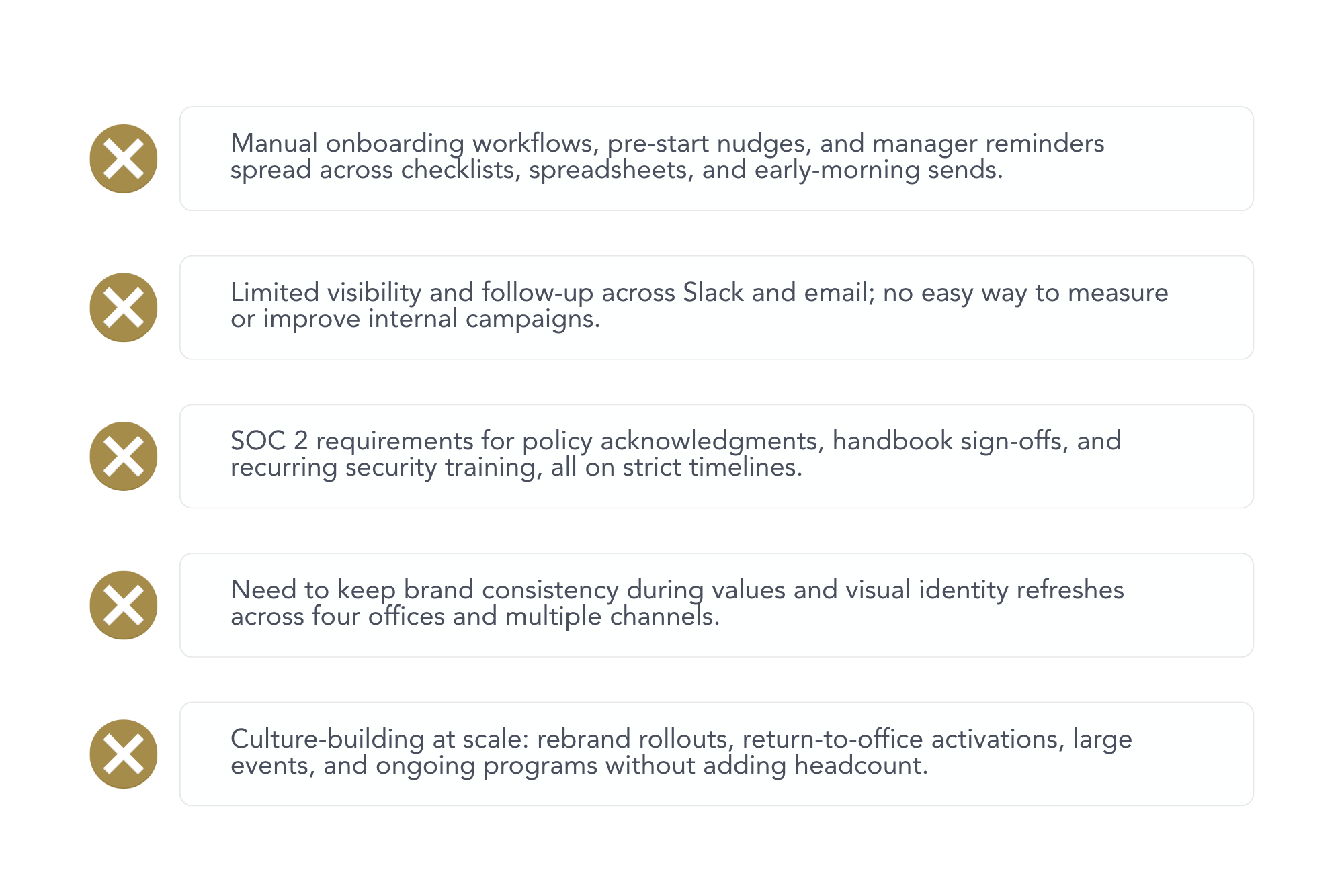 Culture-building at scale: rebrand rollouts, return-to-office activations, large events, and ongoing programs without adding headcount.