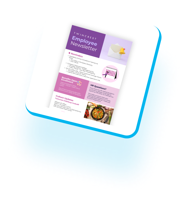 Use AI to instantly generate HR content—from policy updates to manager one-pagers—without needing design resources or copywriters. All on-brand and ready to deploy.